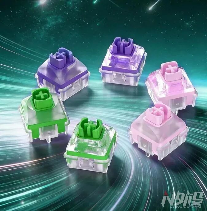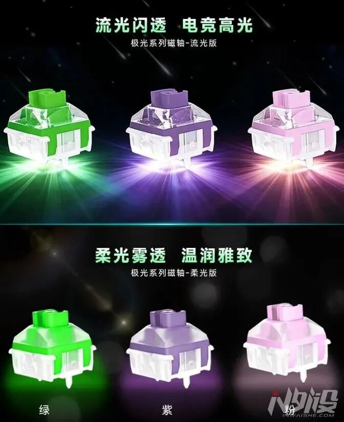 其中,极光磁轴系列永诀有两个版块。一个是流光版,流光亮透,电竞高光,透明上盖加闪粉。一个是柔光版,柔光雾透,温润端淑,雾透版块的上盖底壳。