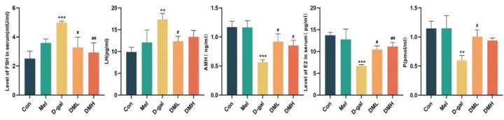 本研究是一项动物实验,旨在评估外源性褪黑素对卵巢早衰(POF)模型小鼠的治疗效果及其对颗粒细胞自噬的调节作用。研究通过D-半乳糖(D-gal)诱导构建了POF小鼠模型,利用其诱导的氧化应激和细胞损伤来模拟POF病理特征。实验选用6-8周龄的C57BL/6雌性小鼠,随机分为五组:对照组(Con)、褪黑素组(Mel)、模型组(D-gal)、低剂量褪黑素干预组(DML)和高剂量褪黑素干预组(DMH),每组5只小鼠。实验持续42天,所有小鼠在实验结束时安乐死,收集血液和卵巢组织样本用于分析。