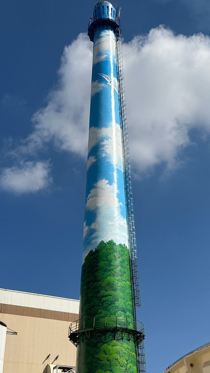 采用水平仪 + 垂直线锤结合卷尺,从烟囱顶部到底部弹出图案的基准线和轮廓线,确保图案水平垂直、比例精准;大型图案可分段放线,每段设置控制点。