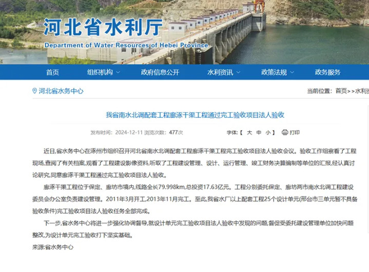 根据河北省水利厅官方网站公布的消息,2024年12月,河北省水利厅党组第一巡察组对河北省水务中心党委巡察之后,河北省水务中心在涿州市组织召开河北省南水北调配套工程廊涿干渠工程完工验收项目法人验收会议。验收工作组经认真讨论研究,同意廊涿干渠工程通过完工验收项目法人验收。
