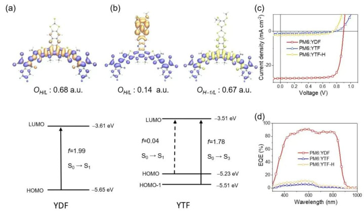含有高能量孤对电子的杂原子(如 N、O、S)会主动参与分子的 π 共轭体系,由于孤对电子的能量本身高于碳原子的 π 电子,其参与共轭后会显著提升 HOMO 轨道的能量,对 LUMO 轨道能量影响较小,最终导致分子能隙变小。