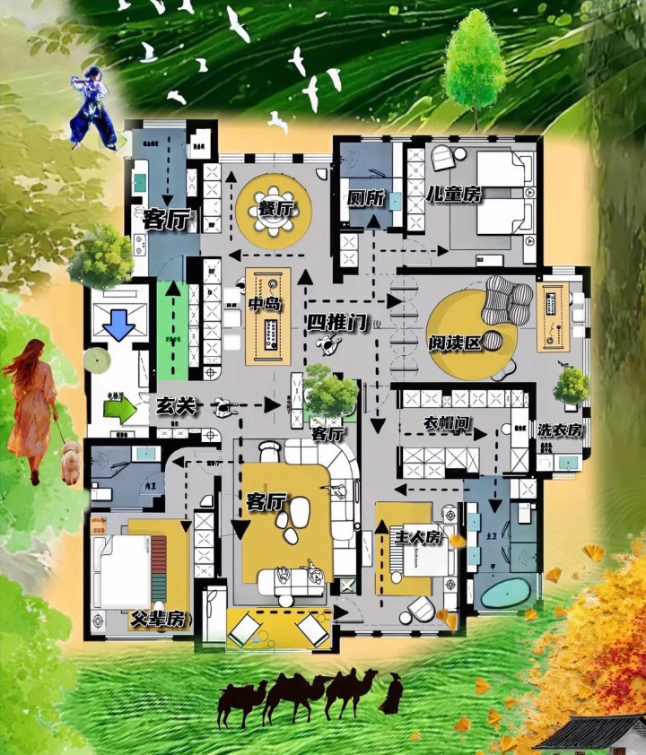 这种“四联横厅”加“全屋洄游”的设计,简直就是给房子装了“自动驾驶”,人在屋里走,景在四周流。