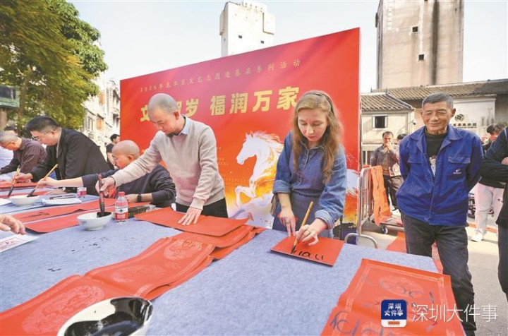 红联映古墟,墨香润民心。由龙华区文联主办的“文艺贺岁福润万家”2026文艺志愿者进基层系列活动近日在观澜古墟举行。活动汇聚了区书法家协会、美术家协会、版画家协会、民间文艺家协会、文艺志愿者协会、龙华印社等六大文艺家协会的15位艺术名家,并特邀来自保加利亚、乌克兰、黑龙江的多位艺术家参与,以艺术传递温暖,将浓浓年味送到市民身边。
