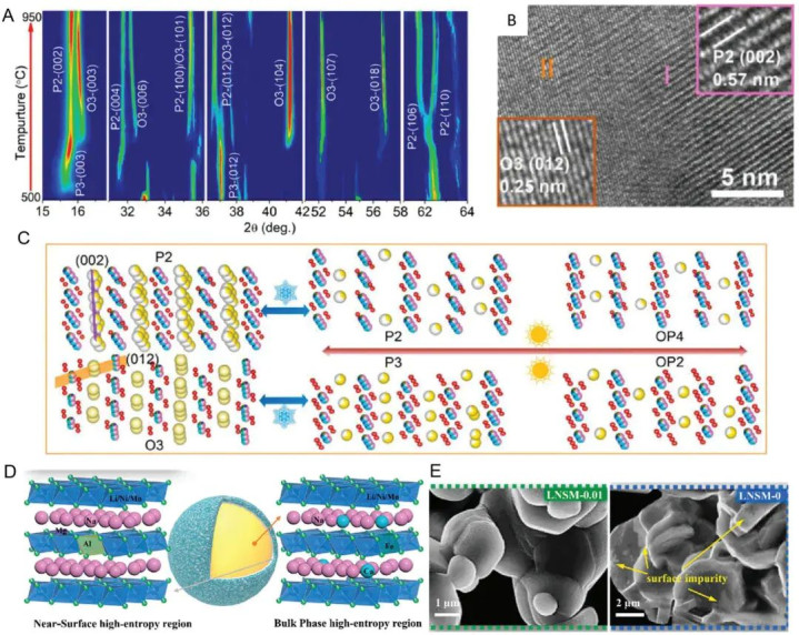 例如,图6B通过原子力显微镜(HRTEM)证实了双相P2/O3在相界的存在。这种P2/O3-NaMnNiCuFeTiOF阴极展现出优异的初始库仑效率、宽温区间内的高容量保持率以及存储稳定性。