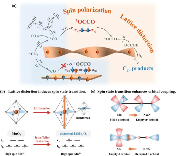 在手性材料中,晶格畸变可与自旋选择性效应结合,稳定特定反应中间体,促进多碳产物的生成。