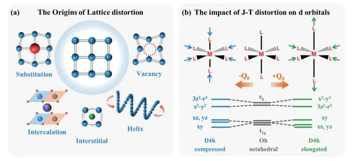 图3 a)晶格畸变的成因。b) Jahn-Teller畸变对d轨道的影响,主要表现为配体在特定方向上的伸长或压缩,导致(d)轨道能级重新分裂。
