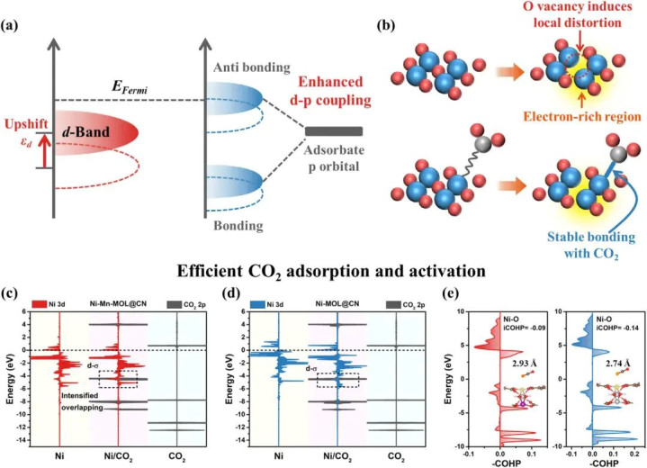 如图10(c-e)所示,在Ni金属有机层中通过Mn离子交换诱导Jahn-Teller畸变,导致Ni位点的d带中心上移并增强了其d轨道与CO₂分子p轨道的耦合,从而显著强化了对CO₂的吸附与活化。