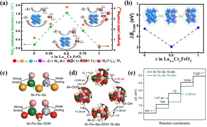 图9 b)计算(DFT+U)氧空位形成能(ΔEf,vac),c) Fe和Ni位点上氧原子吸附的示意图。d) Ni–Fe–Se–OOH在Ni位点的OER示意图 e) Ni–Fe–Se(210)表面模型上Ni和Fe位点OER的自由能图。