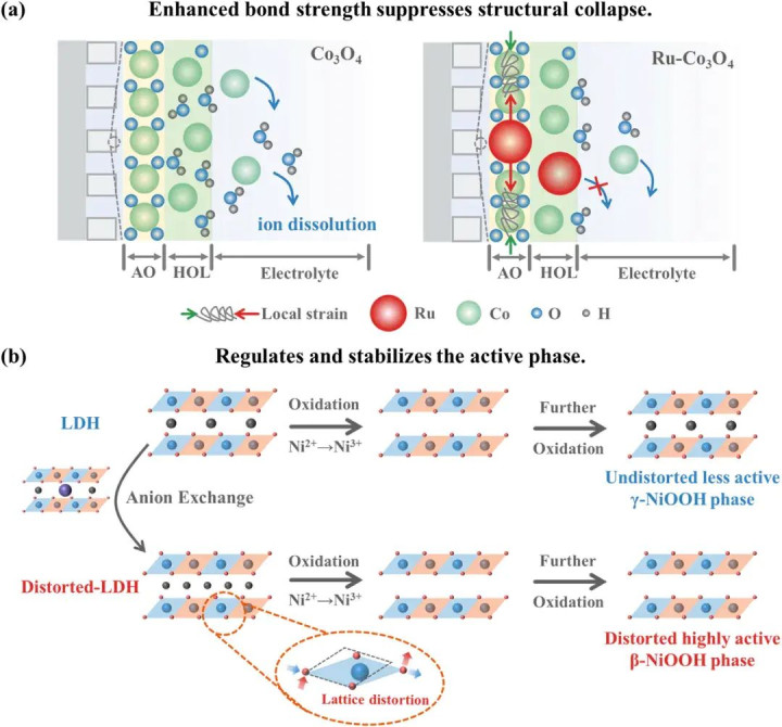 图12 a) 通过增强键合强度抑制晶格畸变导致的结构崩塌示意图,b) 通过调节活性相转变增强晶格畸变以提高催化剂稳定性的示意图。