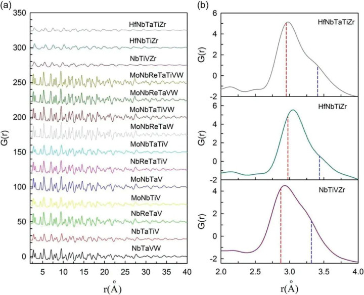 图7a,b展示了多种体心立方难熔高熵合金的简化PDF G(r)。与不含Zr和Hf的合金中尖锐的PDF峰不同,含Zr和/或Hf的合金在第一和第二原子壳层上明显表现出一个宽泛的PDF峰(图7b),这表明存在强烈的晶格畸变。