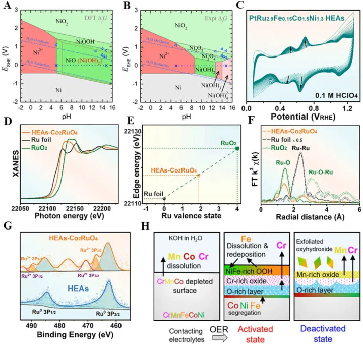 如图4,对重构的HEAsCo2RuO4进行 XANES / EXAFS 分析显示,RuO2与Ru箔之间存在能量吸收,证实了 Ru𝛿 +物种的存在(图4D,E)。 EXAFS 分析识别出Ru─M和Ru─O键,米兰app官方网站表明Ru以合金Ru和Ru3+形式存在(图4F)。