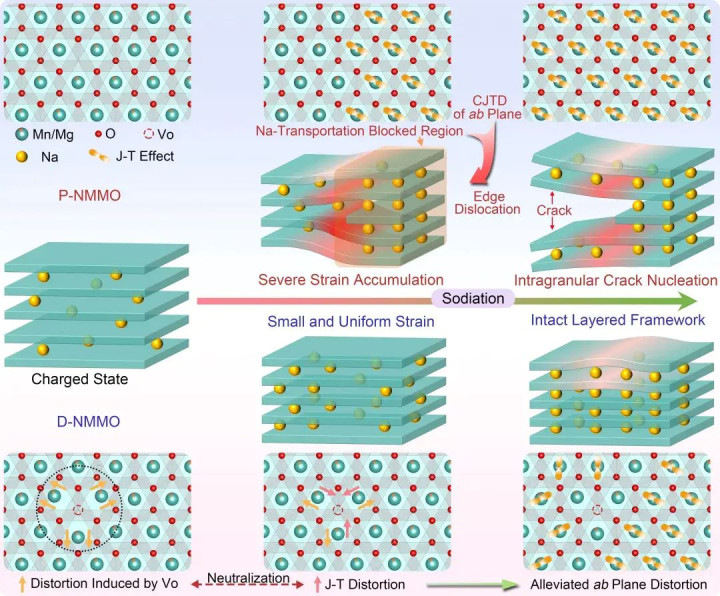 如下图是一种“固有畸变对抗J-T畸变”的机制。固有畸变与Jahn-Teller效应畸变的相反变形方向确保了在钠离子嵌入时,材料的ab平面内和沿c轴方向的应变较小且分布均匀,从而有效缓解了P2-P’2相变,抑制了边缘位错的形成,延缓了裂纹扩展,极大的提高了材料的循环耐久性。