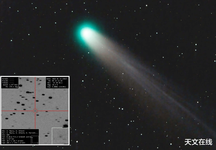 这颗新发现的彗星被定名为C2026A1(MAPS),由法国天文体家团队在智利阿塔卡马沙漠的AMACS1天文台发现。据《天际与千里镜》杂志报谈,它的宽度约为1.5英里(2.4公里),初次被不雅测到时与太阳的距离略突出地球与太阳距离的两倍。