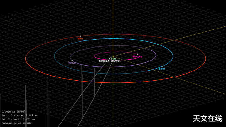 新发现的掠日彗星C2026A1(MAPS)将在4月初围绕咱们的恒星进行一次极近的弹弓式飞行,况兼可能会变得富足亮堂,在白天无需千里镜就能看到。