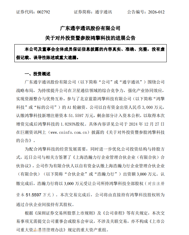 1月23日,通宇通讯(002792.SZ)公告称,公司参与了北京蓝箭鸿擎科技有限公司的A1轮融资。公司以自有资金出资3000万元,认缴鸿擎科技新增注册资本51.5597万元,米兰剩余部分计入资本公积,以取得本次增资完成后鸿擎科技的1.8293%股权。近日公司与相关方签署了《上海浩瀚力行企业管理合伙企业(有限合伙)合伙协议》,公司作为有限合伙人以自有资金认缴浩瀚力行出资额3000万元。认缴完成后,浩瀚力行将以3000万元受让公司所持鸿擎科技全部股权(对应注册资本51.5597万元)。本次交易完成后,公司将由直接持有鸿擎科技股权转为通过合伙企业间接持有其股权。