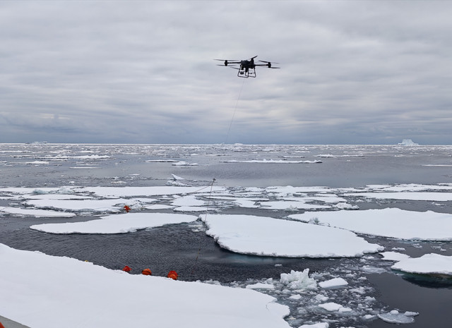 船时2026年1月25日4时许,“雪龙”号无人机抛下的锚钩成功捕获“锚碇式潜标观测系统”(俗称潜标)缆绳。(受访者供图)