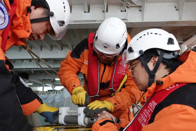 船时25日4时许。“抓住了!”随着一声惊呼,无人机抛下的锚钩成功捕获“锚碇式潜标观测系统”(俗称潜标)缆绳。“雪龙”号上的考察队员们应声齐聚船尾,像拔河一样将沉重的浮球组拉上甲板。