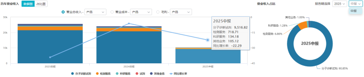 作为营收占比高达九成的核心业务,分子诊断试剂销售遭遇重创,2025年上半年收入同比下降近20%,毛利同样下滑超20%,毛利率下降4.2个百分点。检测服务业务的困境更为突出,同期收入同比下滑30.2%,毛利率更是降至-24.54%,陷入实质性亏损状态。