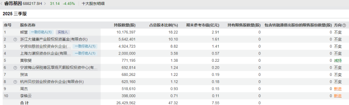 2025年中报显示,睿昂基因上半年营收1.047亿元,同比下降22.29%;归母净利润为355.43万元,同比下降61.46%;扣非归母净利润由盈转亏至282.74万元。